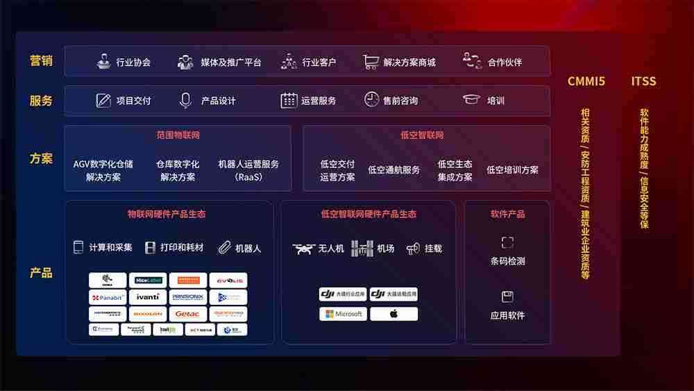 聚合国内外先进的物联网硬件产品品牌,,,,聚焦数字化仓储、、、机器人运营、、低空智联网等领域,,,共同打造适合客户业务场景的解决方案并提供交付服务